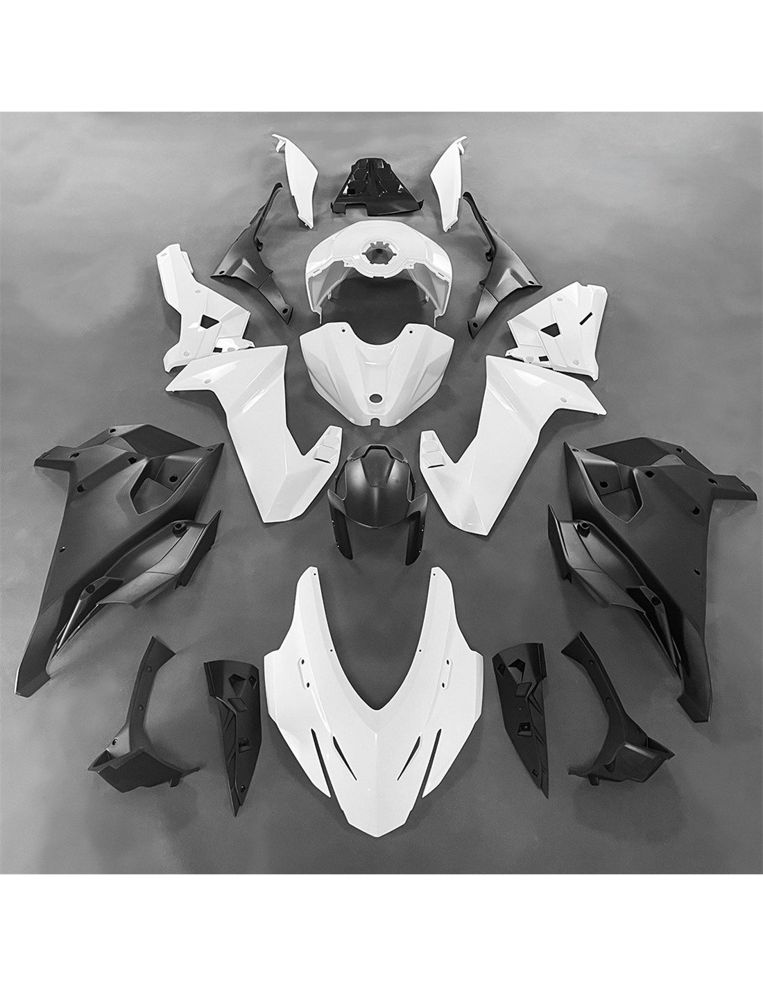 Die Verkleidungssatz enthält: Frontverkleidung, Seitenverkleidung rechts und links, Unterverkleidung, Heck, Kotflügel vorne, Tankabdeckung und alle eventuellen inneren schwarzen Kunststoffe.