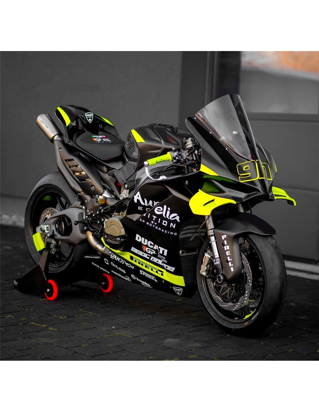 Das Verkleidungskit umfasst: geschlossene Frontverkleidung, rechte und linke Seitenverkleidung, Racing-Unterverkleidung kompatibel mit hochgelegter Akrapovic-Auspuffanlage. Nicht kompatibel mit Seitenständer.