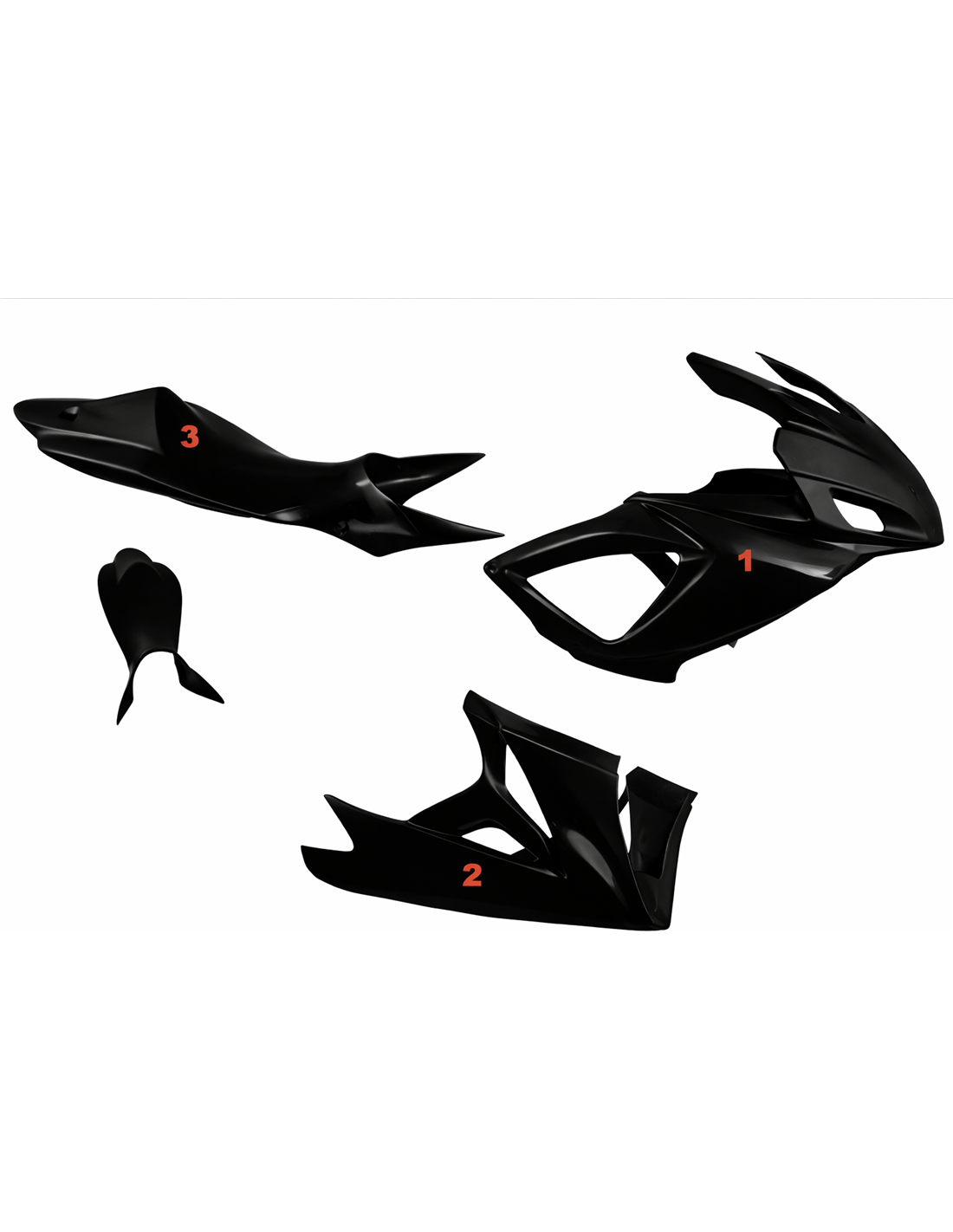 Die Verkleidungssatz enthält: Frontverkleidung, Seitenverkleidung rechts und links, Unterverkleidung, Heck (Tankabdeckung ist nicht eingeschlossen).