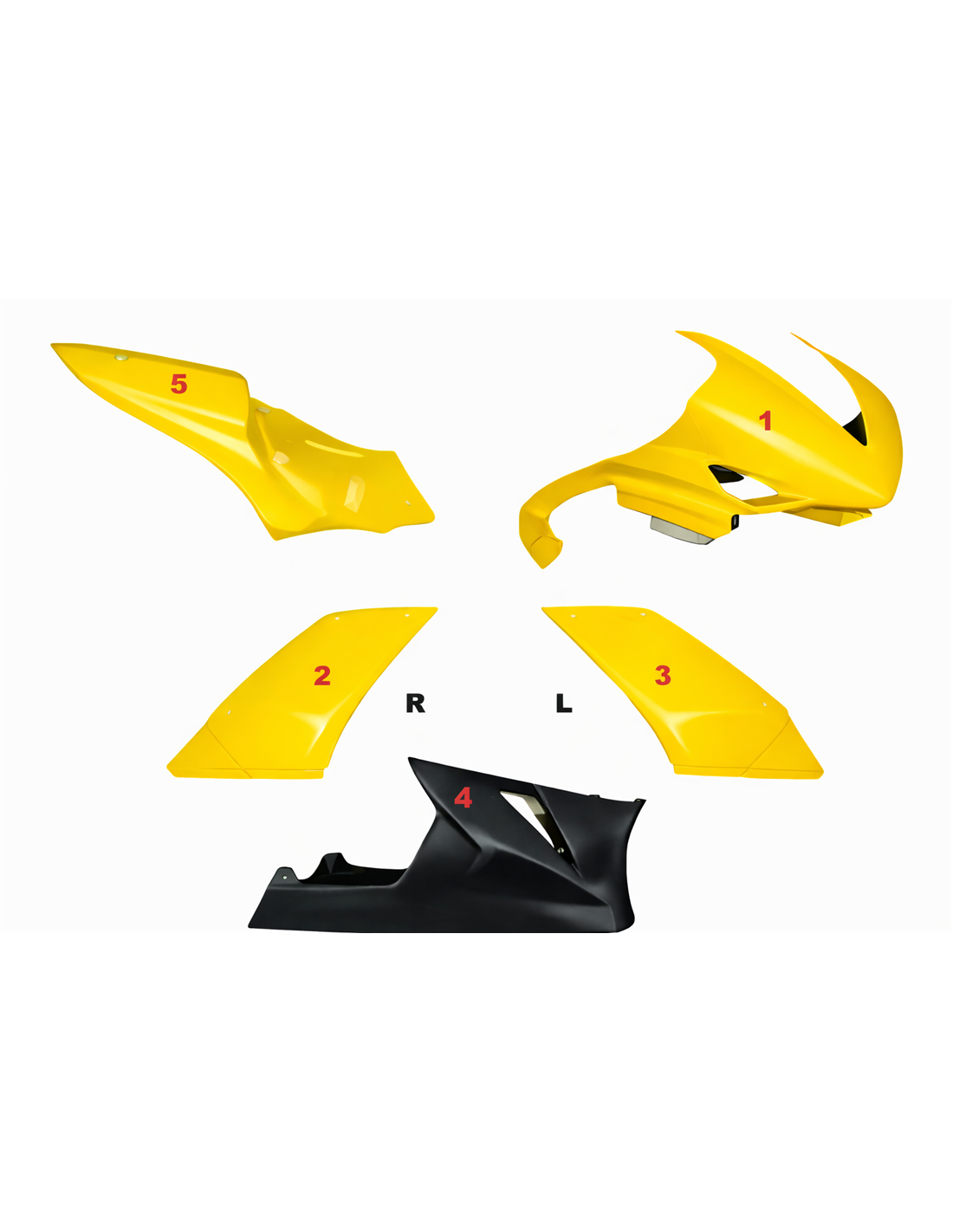 Die Verkleidungssatz enthält: Frontverkleidung, Seitenverkleidung rechts und links, Unterverkleidung, Heck (Tankabdeckung ist nicht eingeschlossen).