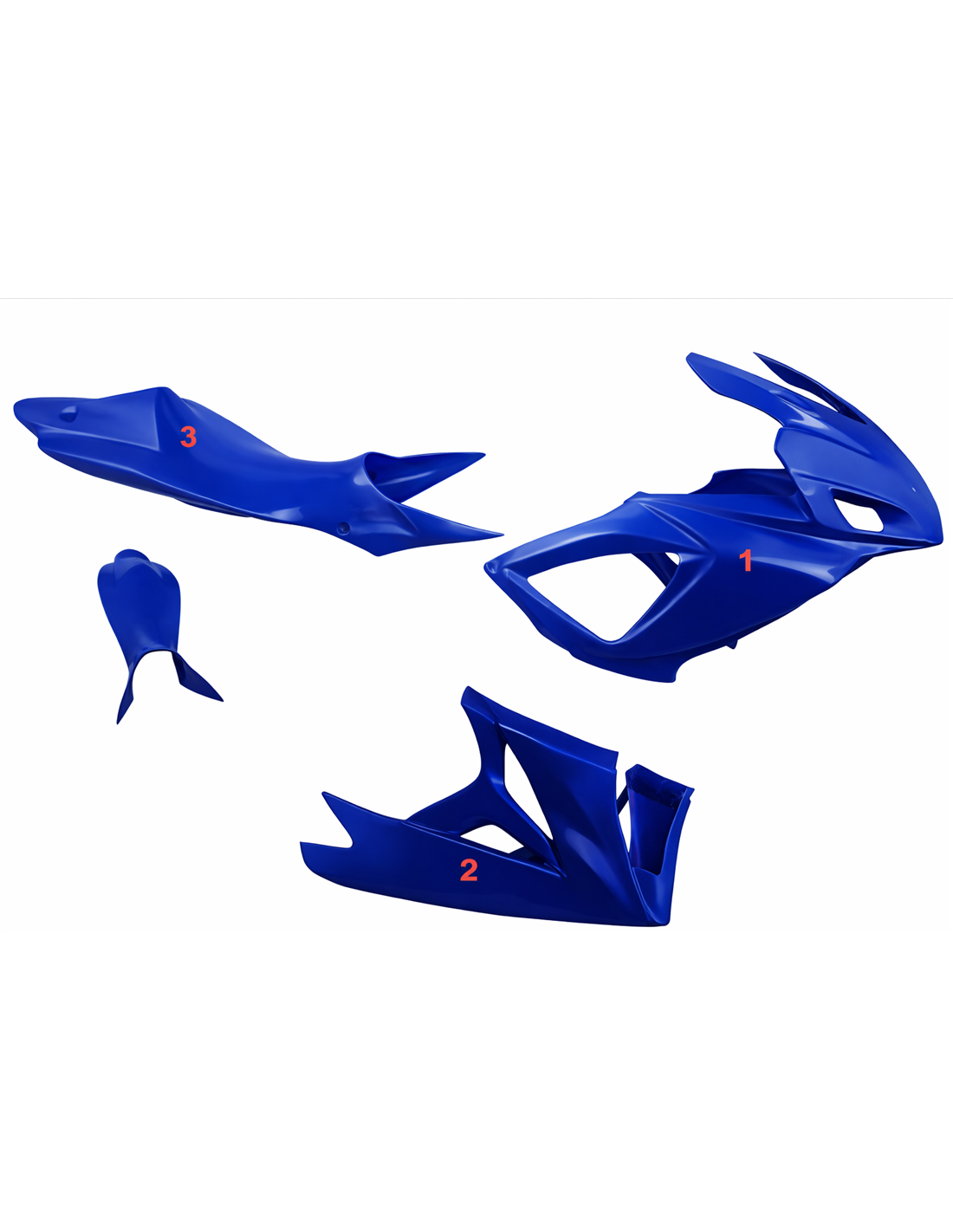 Die Verkleidungssatz enthält: Frontverkleidung, Seitenverkleidung rechts und links, Unterverkleidung, Heck (Tankabdeckung ist nicht eingeschlossen).
