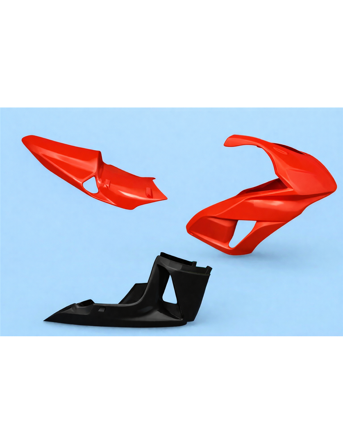 Die Verkleidungssatz enthält: Frontverkleidung, Seitenverkleidung rechts und links, Unterverkleidung, Heck (Tankabdeckung ist nicht eingeschlossen).