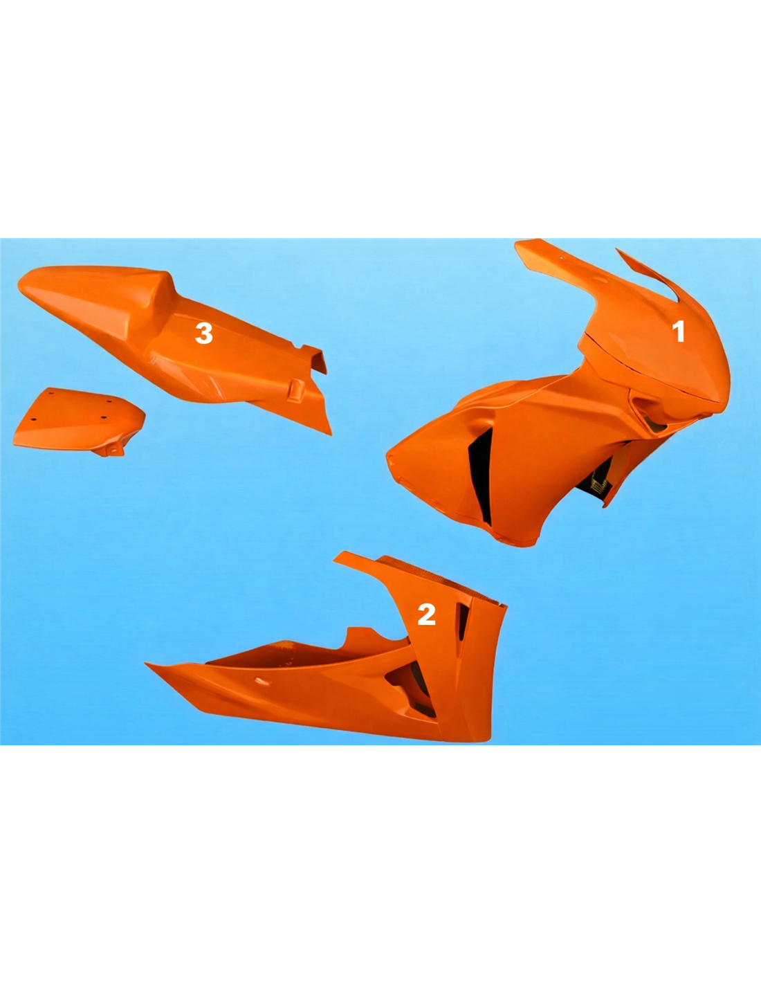Die Verkleidungssatz enthält: Frontverkleidung, Seitenverkleidung rechts und links, Unterverkleidung, Heck (Tankabdeckung ist nicht eingeschlossen).