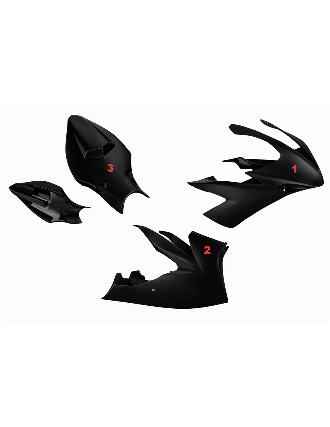 Die Verkleidungssatz enthält: Frontverkleidung, Seitenverkleidung rechts und links, Unterverkleidung, Heck (Tankabdeckung ist nicht eingeschlossen).