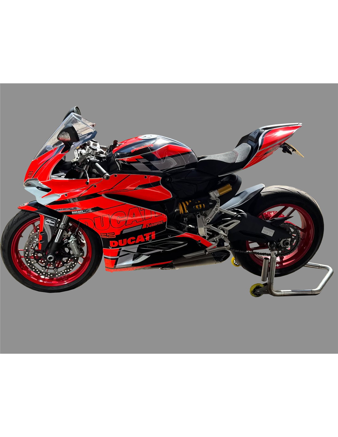 Elite: utilizamos los colores originales de la moto (Rojo Ducati); los adhesivos están impresos con varios tonos gracias a nuestro plotter de corte y de impresión de 8 colores con tintas ECO-SOLMAX2 con una alta calidad y resistencia a la luz solar hasta 7 años garantizados por la empresa APA Italia que nos da los materiales necesarios para el corte y la impresión. Los adhesivos están cubiertos por tres capas de transparente y eso los hace brillar durante 7 años. Además todo el carenado está pintado en el interior.