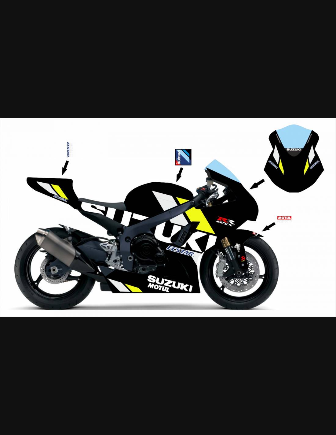 Elite: utilizamos pinturas de alta calidad con tonalidades similares a las originales. Las pegatinas se imprimen con impresoras de 8 colores que les dan un brillo y matices impecables. Todo el gráfico se encuentra bajo tres capas de transparente para mantener los colores del carenado brillantes con el tiempo. También pintamos todo el kit de carenado por dentro.
