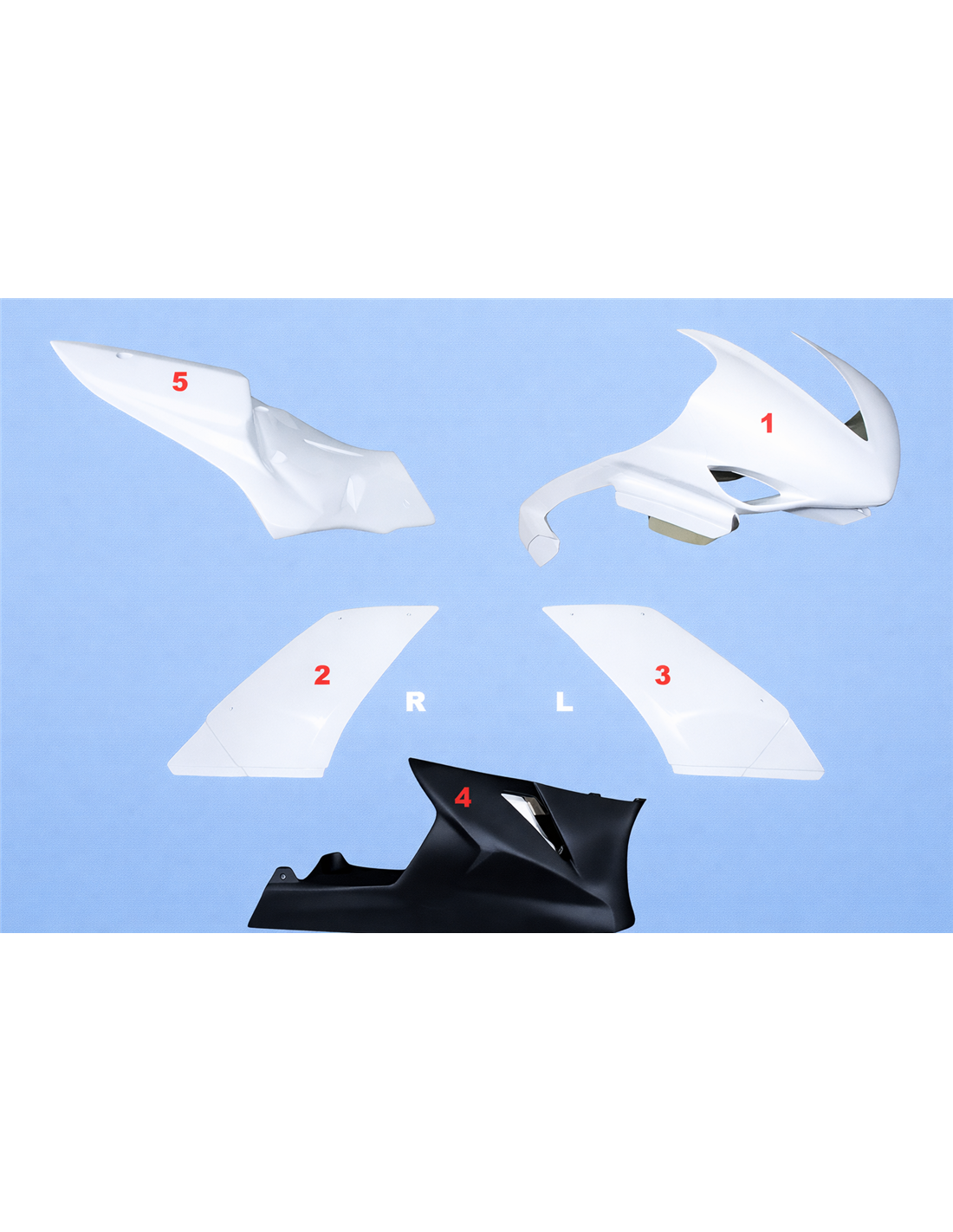 El kit de carenados incluye: carenado frontal, laterales de derecha y izquierda, quilla cerrada homologada para la pista, colin (el cubre deposito no se incluye en el precio).