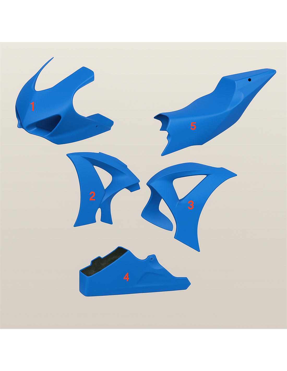 El kit de carenados incluye: carenado frontal, laterales de derecha y izquierda, quilla cerrada homologada para la pista, colin (el cubre deposito no se incluye en el precio).