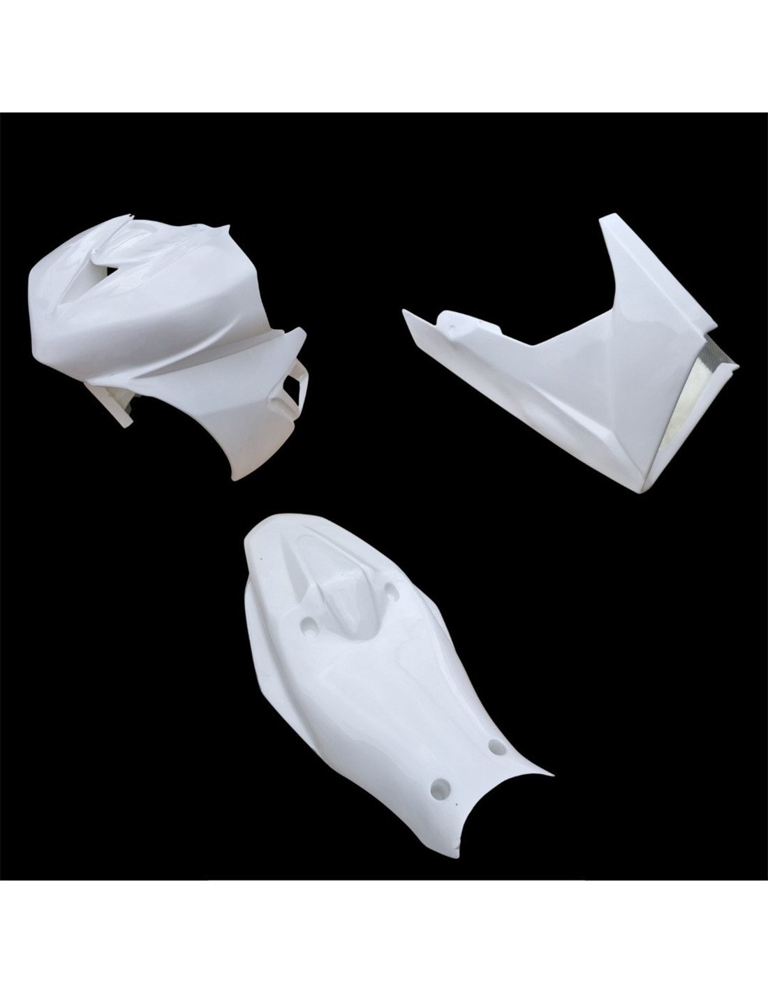 Nuestros carenados racing son en fibra de vidrio, tienen refuerzos en carbono y kevlar en las areas de major stress. Se incluye una quilla cerrada, entonces nuestros carenados son homologados para las competiciones profesionales y amatoriales en las pistas. Indicamos donde tiene que hacer los agujeros, asì puede hacer el agujero de la dimension correcta de su tornillo.