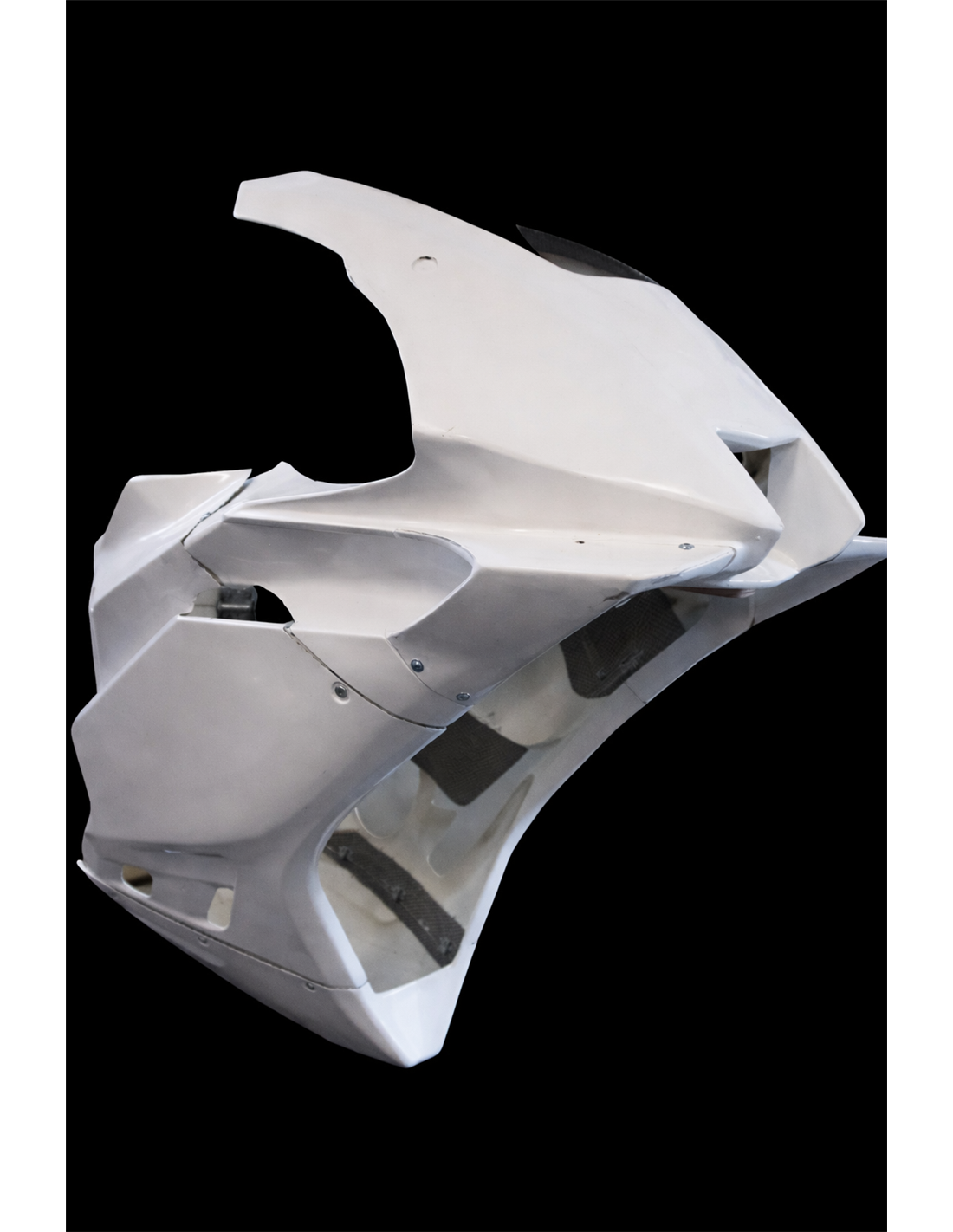 Nuestros carenados racing son en fibra de vidrio, tienen refuerzos en carbono y kevlar en las areas de major stress. Se incluye una quilla cerrada, entonces nuestros carenados son homologados para las competiciones profesionales y amatoriales en las pistas. Indicamos donde tiene que hacer los agujeros, asì puede hacer el agujero de la dimension correcta de su tornillo.