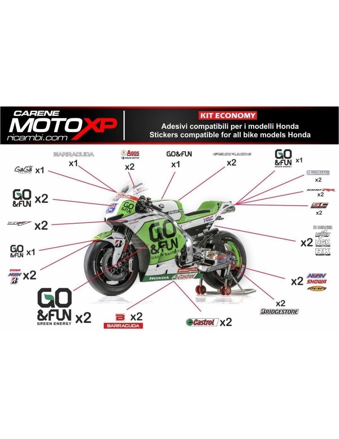 Los adhesivos están hechos de materiales de primera calidad y están dimensionados para el tipo de moto indicada en el momento de la compra. El kit se compone de todas las pegatinas no originales, para completar los gráficos elegidos: cupolo, lateral izquierdo y derecho, el tanque, quilla, colin, el basculante y el guardabarros delantero. Las pegatinas también se pueden personalizar (color, números, nombres y otros), escribir todo antes de agregar al carro en el espacio de "información adicional". El costo del kit de adhesivo no varía, excepto por modificaciones sustanciales (por ejemplo, colores fluorescentes). Mediante la compra, se aceptan las condiciones de venta.Se pueden unir por encima y por debajo de transparente. A menos que el cliente solicite lo contrario, el kit se suministra con la protección aplicada.