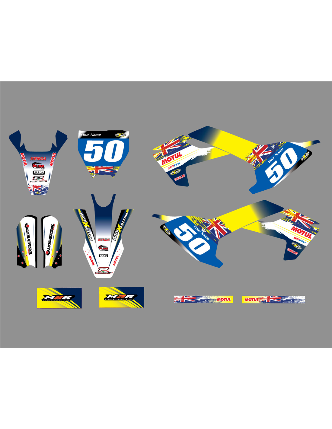 Los adhesivos que producimos están fabricados con materiales crystal de primera calidad que se adaptarán fácil y perfectamente a los plásticos de la motocicleta del cliente. La resistencia del material permite que nuestro gráfico permanezca perfectamente adherido incluso durante las condiciones de uso más difíciles de la motocicleta. La instalación, gracias a los canales de descarga de aire, permite instalar las pegatinas de forma suave y sin burbujas. Utilizamos maquinarias de última generación para la impresión, por lo que podemos imprimir colores brillantes y tonalidades de alta calidad. Incluimos una capa protectora en los adhesivos, para que estén siempre brillantes durante los años y estén protegidas del agua y la suciedad. Es posible personalizar las pegatinas como prefiera. Puede agregar, eliminar o cambiar patrocinadores técnicos, agregar un número de carrera personalizado o su propio nombre. Puede indicar todos los cambios en el campo "Personalización del producto" en el sitio web durante la compra. No nos limitamos solo a los gráficos de nuestro sitio web, puede enviarnos por correo electrónico o WhatsApp una imagen de un diseño que no tenemos, para que podamos hacerle un presupuesto y luego hacerlo. Mediante la compra, se aceptan las condiciones de venta.