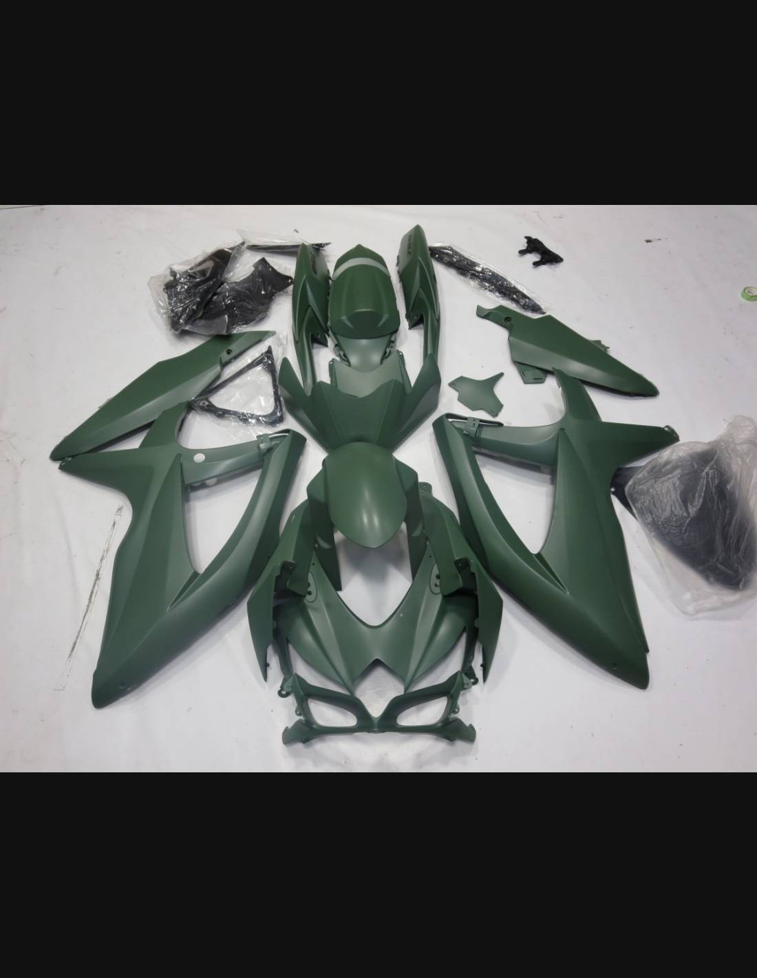 Le kit carénage comprend: tête de fourche, flanc gauche et droit, bas de carénage gauche et droit, coque arrière, garde boue avant et tous les parties noir pour compléter les carénages.