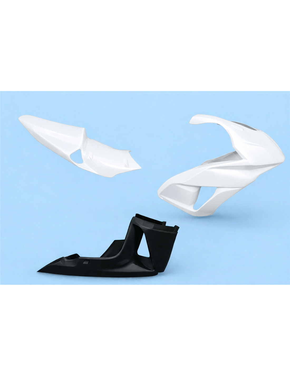 Le kit carénages comprend: tête de fourche, flanc gauche et droit, bas de carénage, coque arrière complet (le cache réservoir n’est pas inclus).