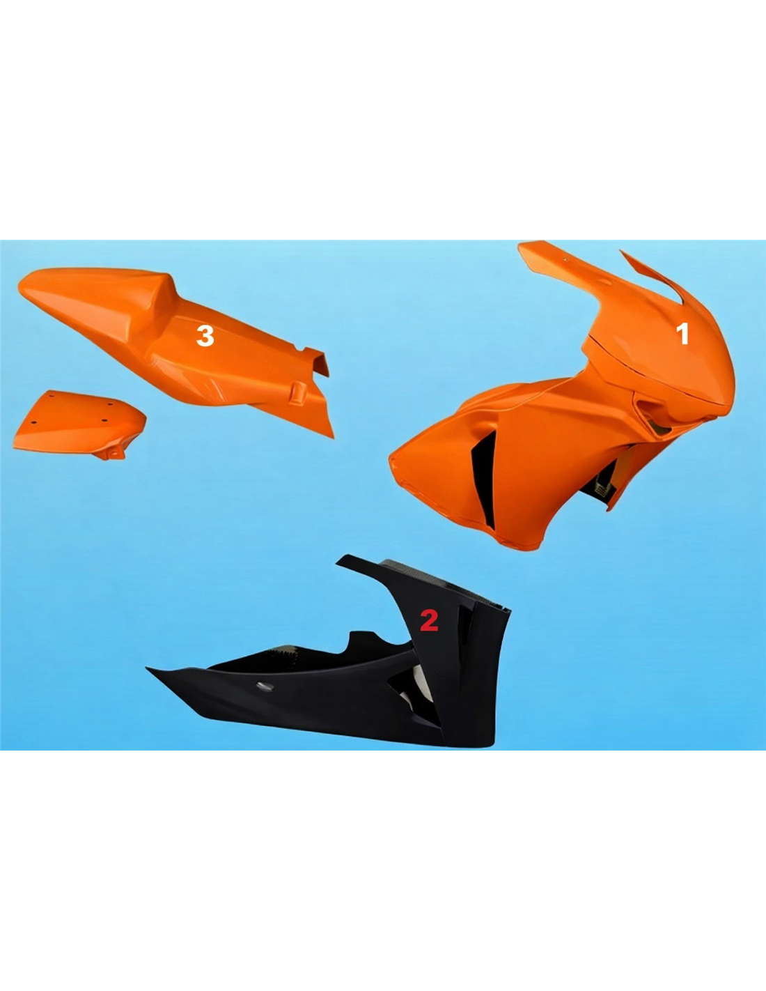 Le kit carénages comprend: tête de fourche, flanc gauche et droit, bas de carénage fermé et homologué pour la piste, coque arrière complet (le cache réservoir n’est pas inclus).