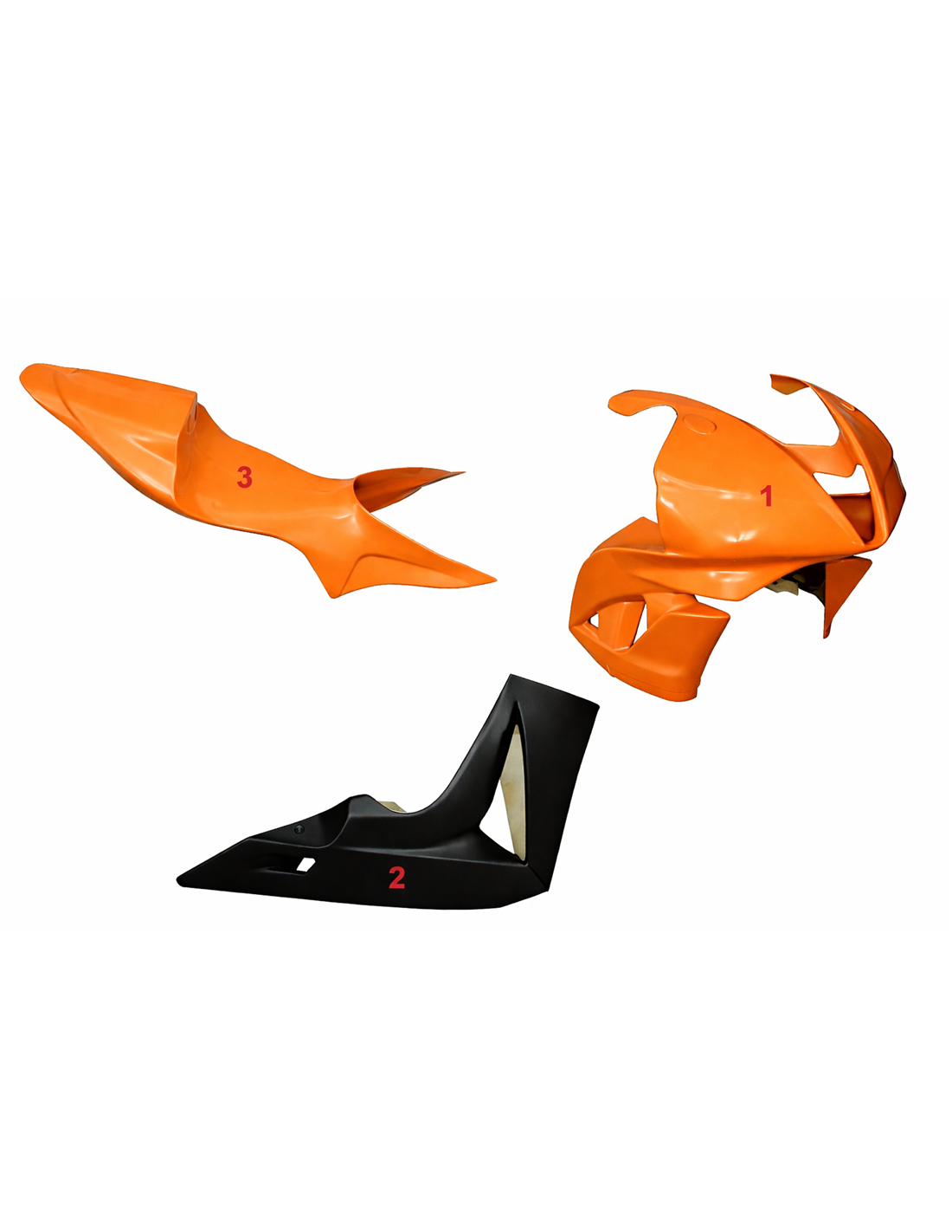 Le kit carénages comprend: tête de fourche, flanc gauche et droit, bas de carénage fermé et homologué pour la piste, coque arrière complet (le cache réservoir n’est pas inclus).