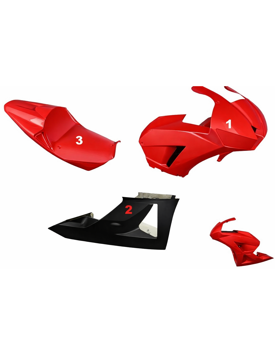 Le kit carénages comprend: tête de fourche, flanc gauche et droit, bas de carénage fermé et homologué pour la piste, coque arrière complet (le cache réservoir n’est pas inclus).