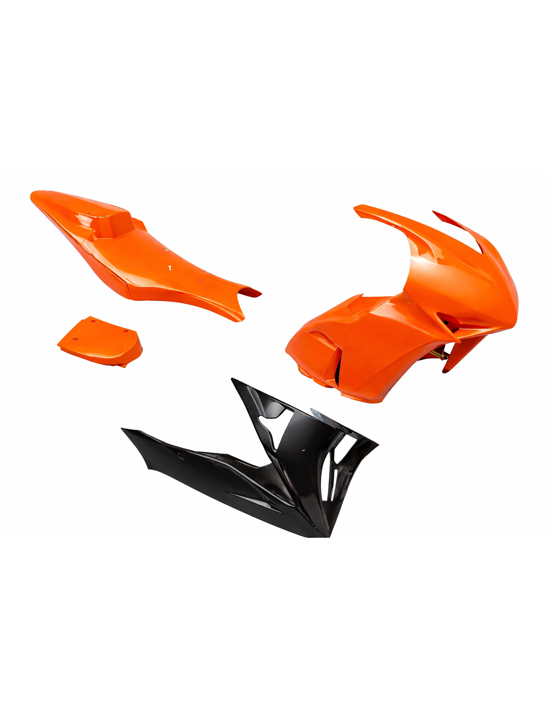 The fairing kit includes: front upper part, right and left side fairings, closed lower fairing approved for the track, tail fairing (the tank cover is not included in the price).