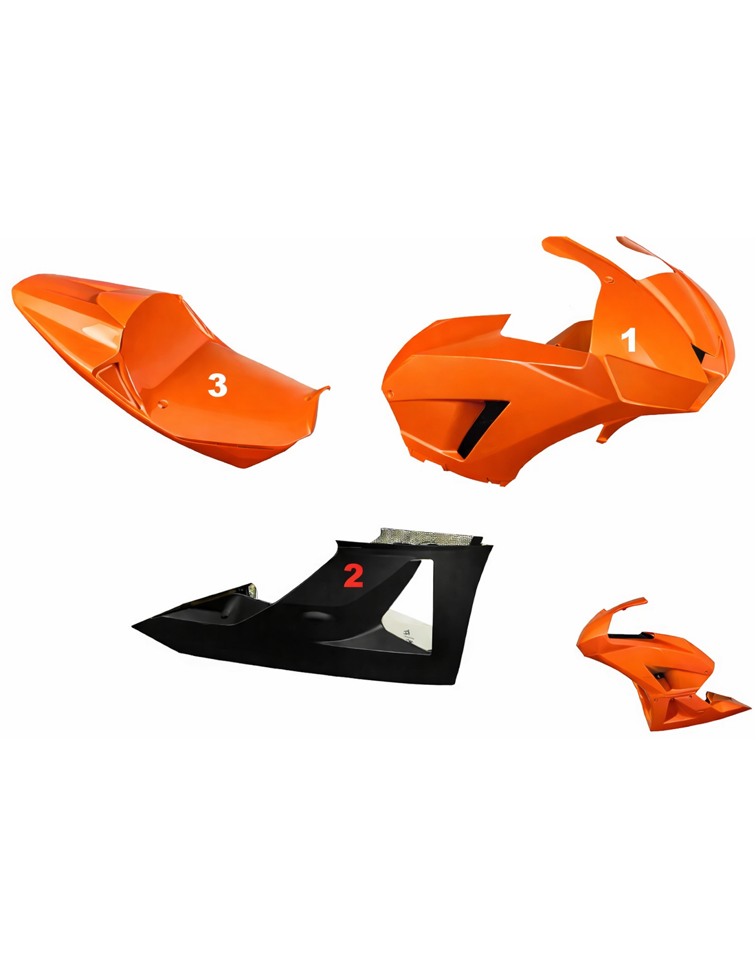 The fairing kit includes: front upper part, right and left side fairings, closed lower fairing approved for the track, tail fairing (the tank cover is not included in the price).