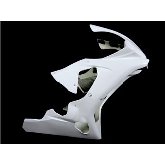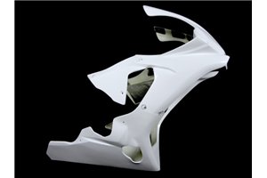 Our race fairings are made of fiberglass, they are reinforced in carbon and Kevlar in the stress areas. We include a closed lower fairing that allows to catch the liquids, so our fairings are approved for the various championships and for the amateur usage on the tracks. We mark where you should drill the holes, so you can make the hole according to the dimension of the screw you are going to use.