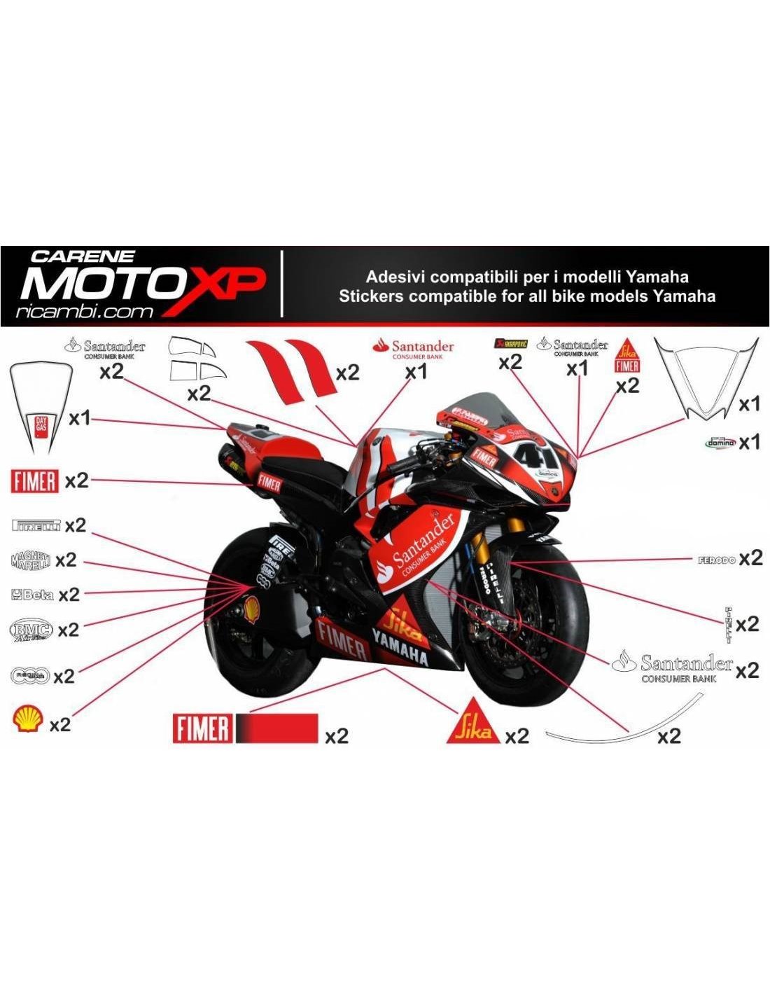 Stickers are produced with high quality materials and are adapted on the dimensions of the bike that the customer indicates during the purchase. The kit includes all non-original stickers, in order to complete the desired design: for front upper part, right and left side fairing, belly pan, back seat, swingarm and front fender. It’s possible to customize stickers too (colours, numbers, names, etc). It’s important to write changes in the field “more information”. The price of the sticker kit doesn’t change, unless substantial modifications (e.g. fluorescent colours). Through the purchase, you accept the sales conditions. You can stick them under the clear coat or after it. Unless a different request of the customer, we will supply the sticker kit with the protection.