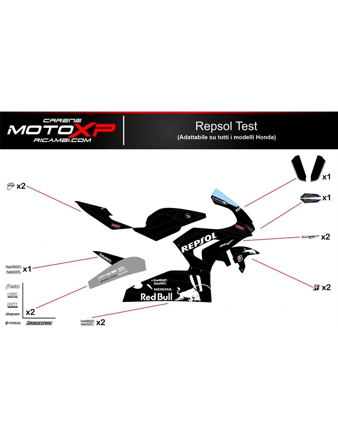 Gli adesivi sono realizzati con materiali di prima qualità e vengono dimensionati per il tipo di moto indicata al momento dell’acquisto. Il kit è composto di tutti gli adesivi non originali, per completare la grafica scelta: per cupolino, carena destra e sinistra, serbatoio, puntale destro sinistro, codino, forcellone e parafango anteriore. Gli adesivi si possono anche personalizzare (colore, numeri nomi o altro) scrivete tutto prima di aggiungere al carrello nello spazio “ulteriori informazioni”. Il costo del kit adesivi non varia, eccetto sostanziali modifiche ad esso (es. colori fluorescenti). Con l’acquisto, si accettano le condizioni di vendita.Si possono attaccare sia sopra che sotto trasparente. Salvo diversa richiesta del cliente, il kit viene fornito con la protezione applicata.