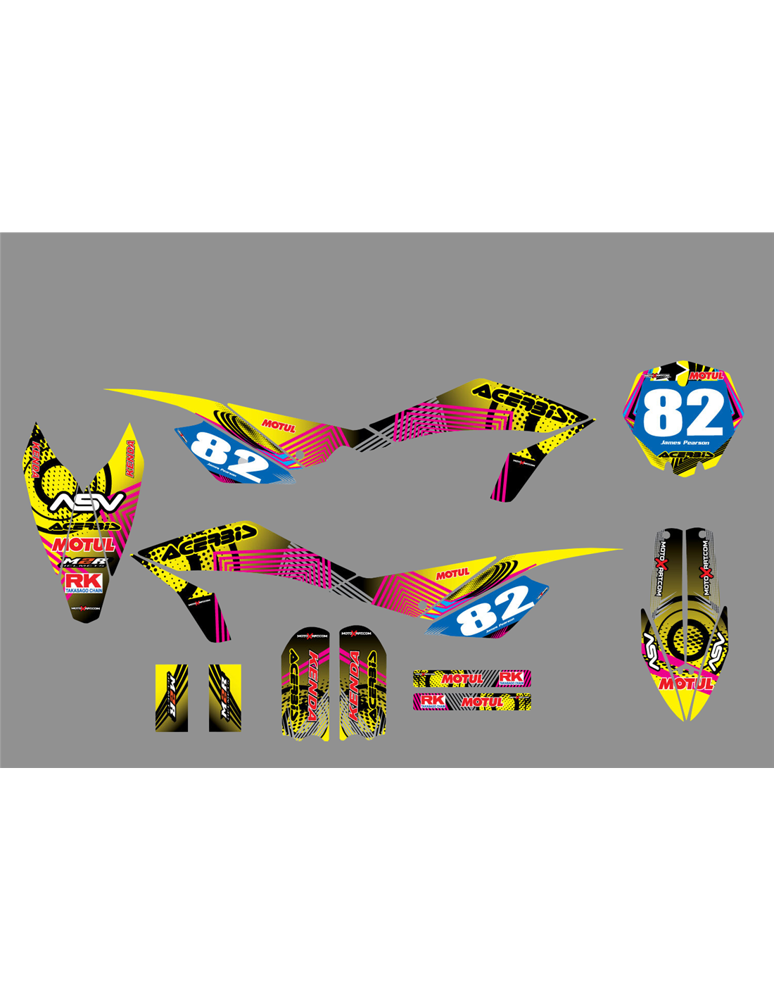 Gli adesivi sono realizzati con materiali crystal di prima qualità che permettono di adattarsi facilmente e perfettamente alle plastiche della moto del cliente. La resistenza del materiale permette alle nostre grafiche di rimanere correttamente incollate anche durante le più difficili condizioni di uso della moto. Il montaggio, grazie ai canali per lo scarico dell’aria, consente di installare agevolmente il prodotto e senza bolle. Utilizziamo macchinari di ultima generazione per la stampa, permettendo di stampare colori brillanti e sfumature in alta definizione. Sugli adesivi includiamo uno strato protettivo che riesce a mantenerli sempre lucenti nel corso degli anni, preservandoli anche da acqua e sporco. È possibile personalizzare il kit adesivi a proprio piacimento. Si possono aggiungere, togliere o sostituire sponsor tecnici, inserire un numero da gara personalizzato o il proprio nome. Si possono indicare tutte le modifiche nell’apposito spazio “Personalizzazione del prodotto” al momento dell’acquisto. Non ci limitiamo solo alle grafiche presenti sul nostro sito, inviandoci tramite mail o WhatsApp la foto di una grafica che non abbiamo, potremo farvi un preventivo e successivamente realizzarla. Con l’acquisto, si accettano le condizioni di vendita.