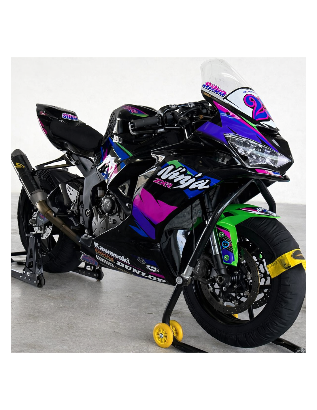 Elite: usiamo i colori compatibili con il serbatoio originale della moto (es. Verde Kawasaki). Gli adesivi vengono stampati utilizzando plotter a 8 colori che conferiscono lucentezza e sfumature impeccabili. Tutta la grafica viene posta sotto tre strati di trasparente per mantenere nel tempo i colori brillanti della carenatura. Inoltre l’intera carena è verniciata anche all'interno.