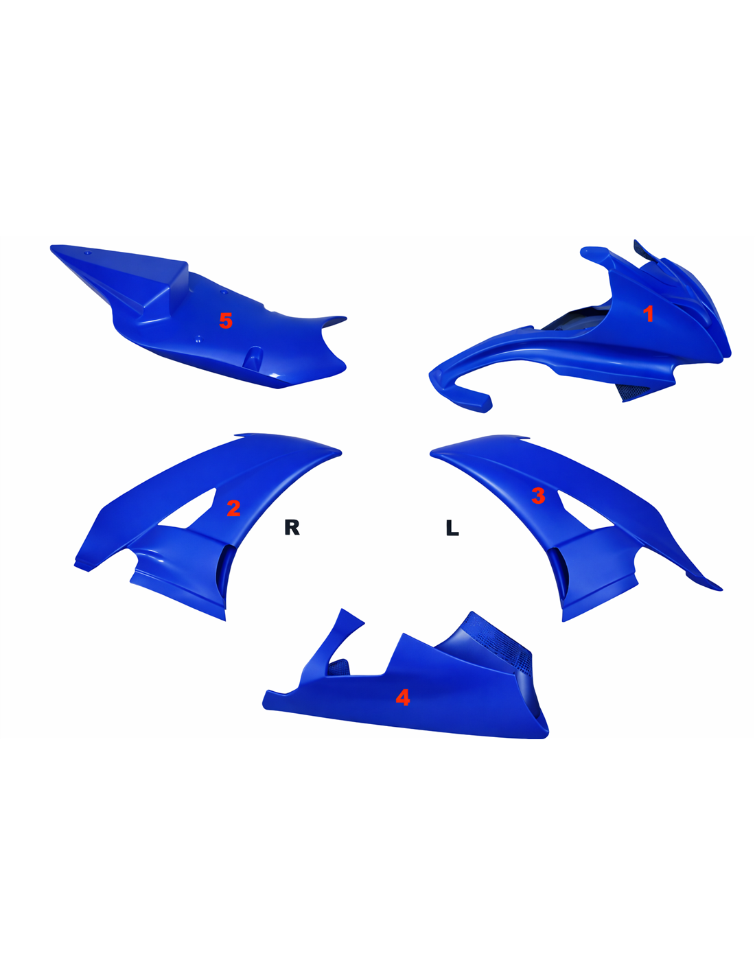 Il kit di carene comprende: cupolino, fianco destro e sinistro, vasca raccogli liquido chiusa ed omologata per la pista,codone (il copriserbatoio non è incluso nel prezzo).