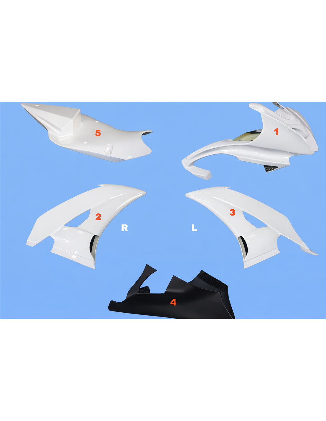 Il kit di carene comprende: cupolino, fianchi destro e sinistro, puntale a vasca, codone (il copriserbatoio non è incluso nel prezzo).