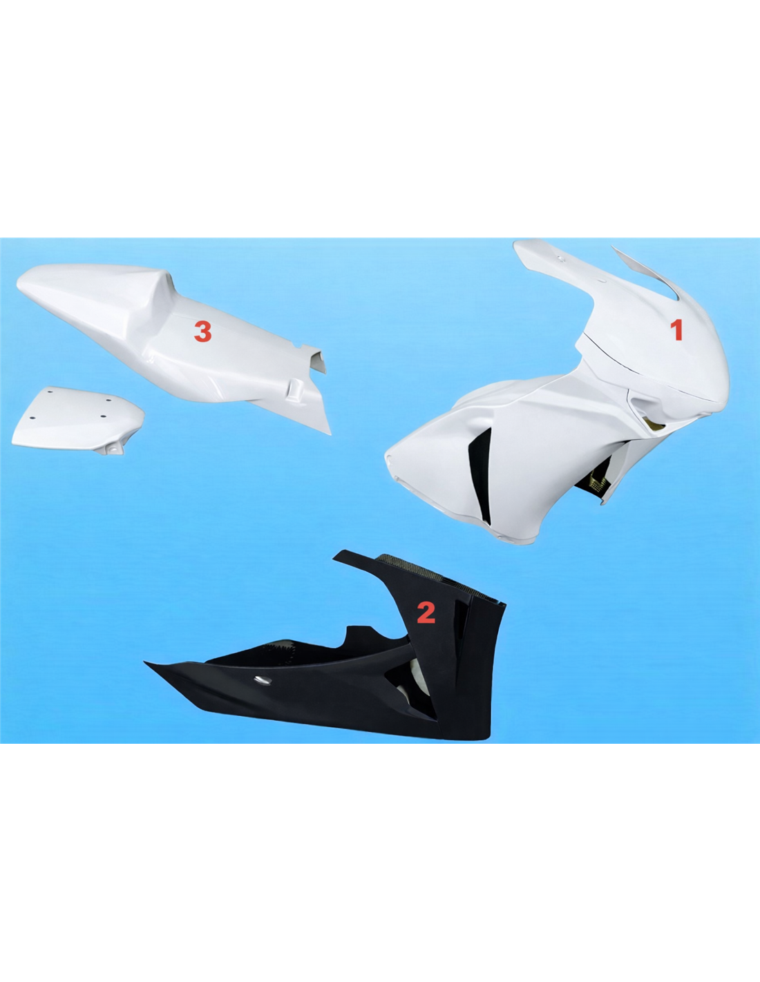 Il kit di carene comprende: cupolino, fianchi destro e sinistro, puntale a vasca, codone (il copriserbatoio non è incluso nel prezzo).