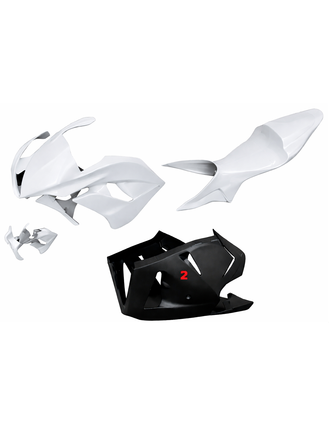 Il kit di carene comprende: cupolino, fianchi destro e sinistro, puntale a vasca, codone (il copriserbatoio non è incluso nel prezzo).