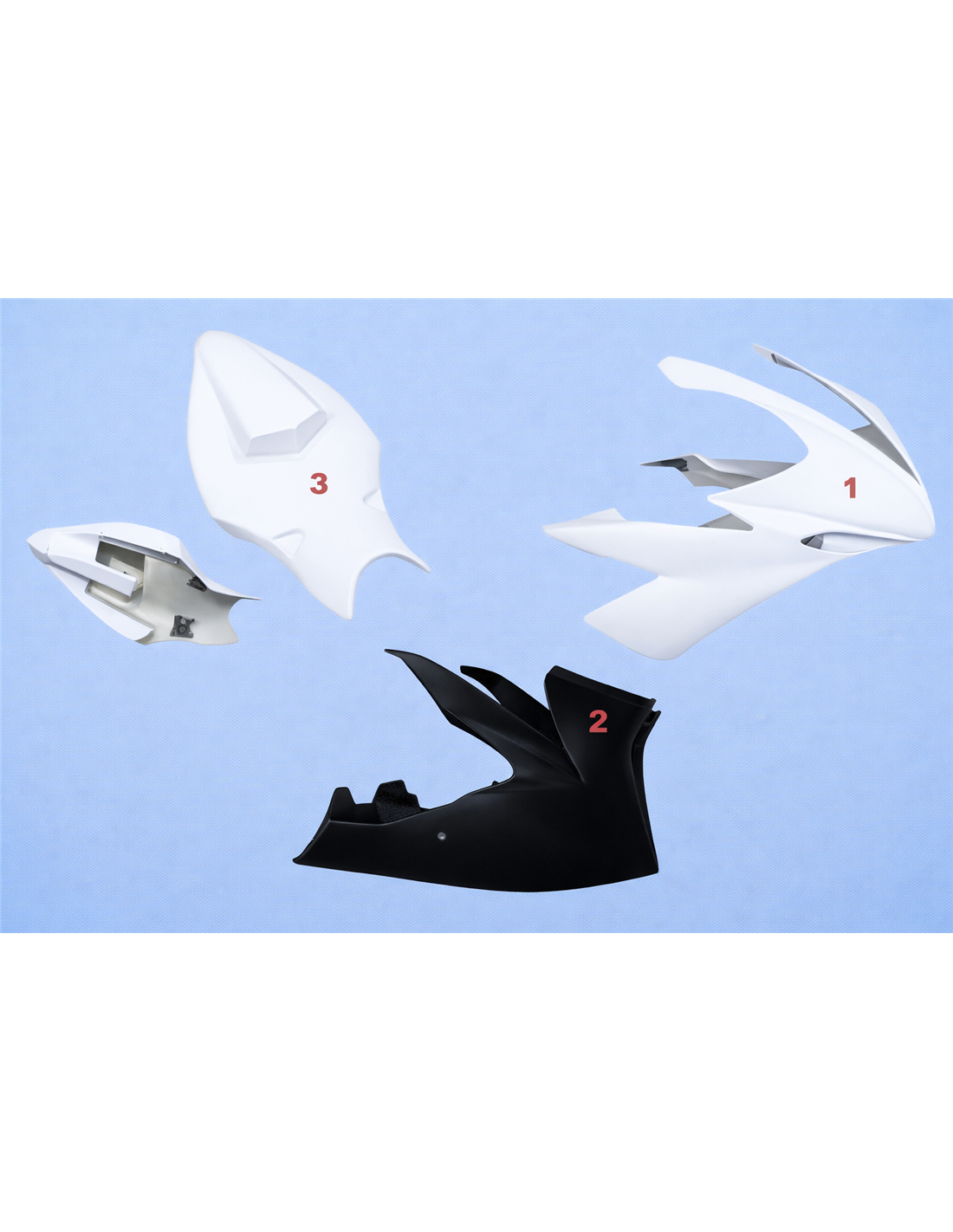 Il kit di carene comprende: cupolino, fianchi destro e sinistro, puntale a vasca, codone (il copriserbatoio non è incluso nel prezzo).