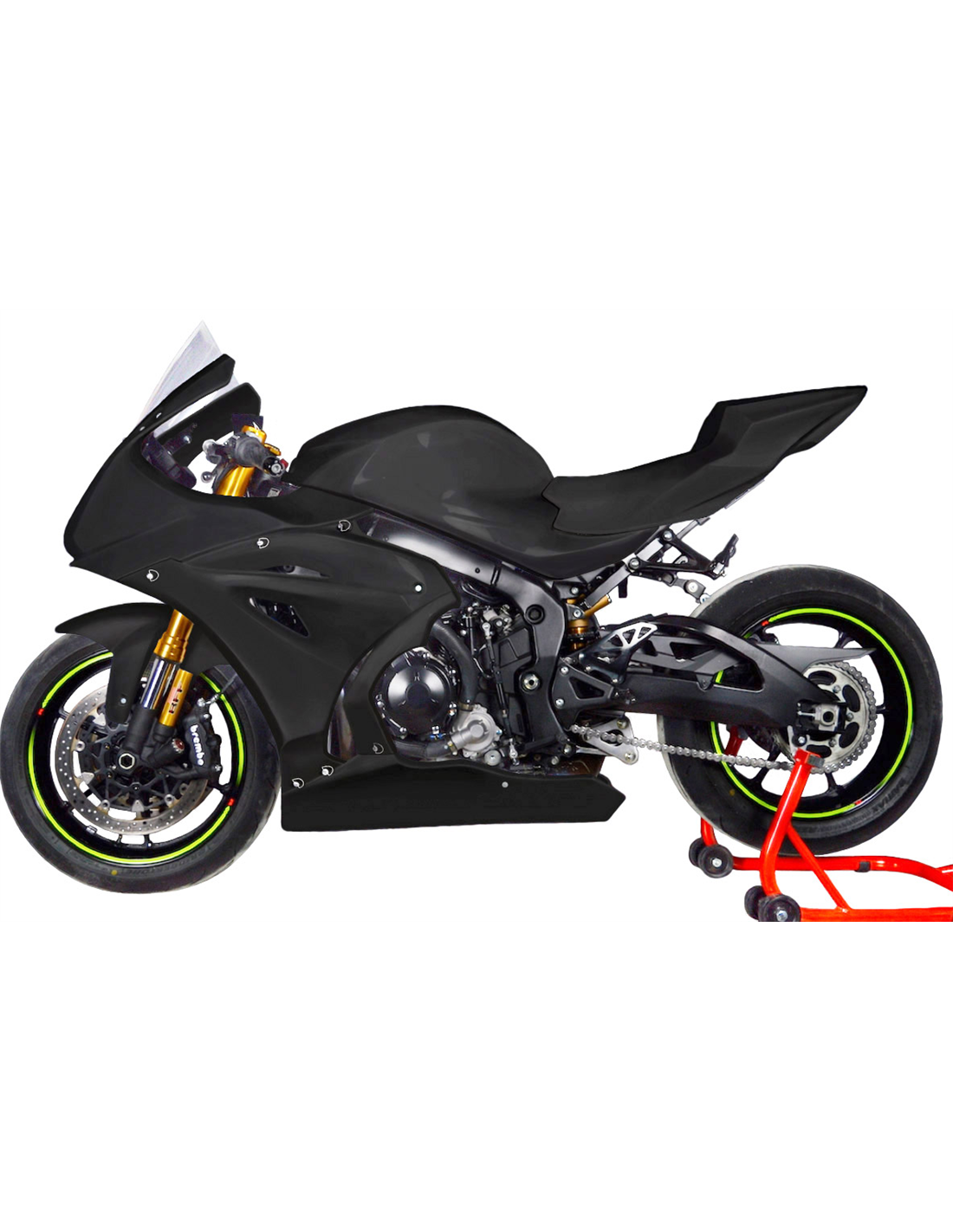 Il kit di carene comprende: cupolino, fianco destro e sinistro, vasca raccogli liquido chiusa ed omologata per la pista,codone (il copriserbatoio non è incluso nel prezzo).