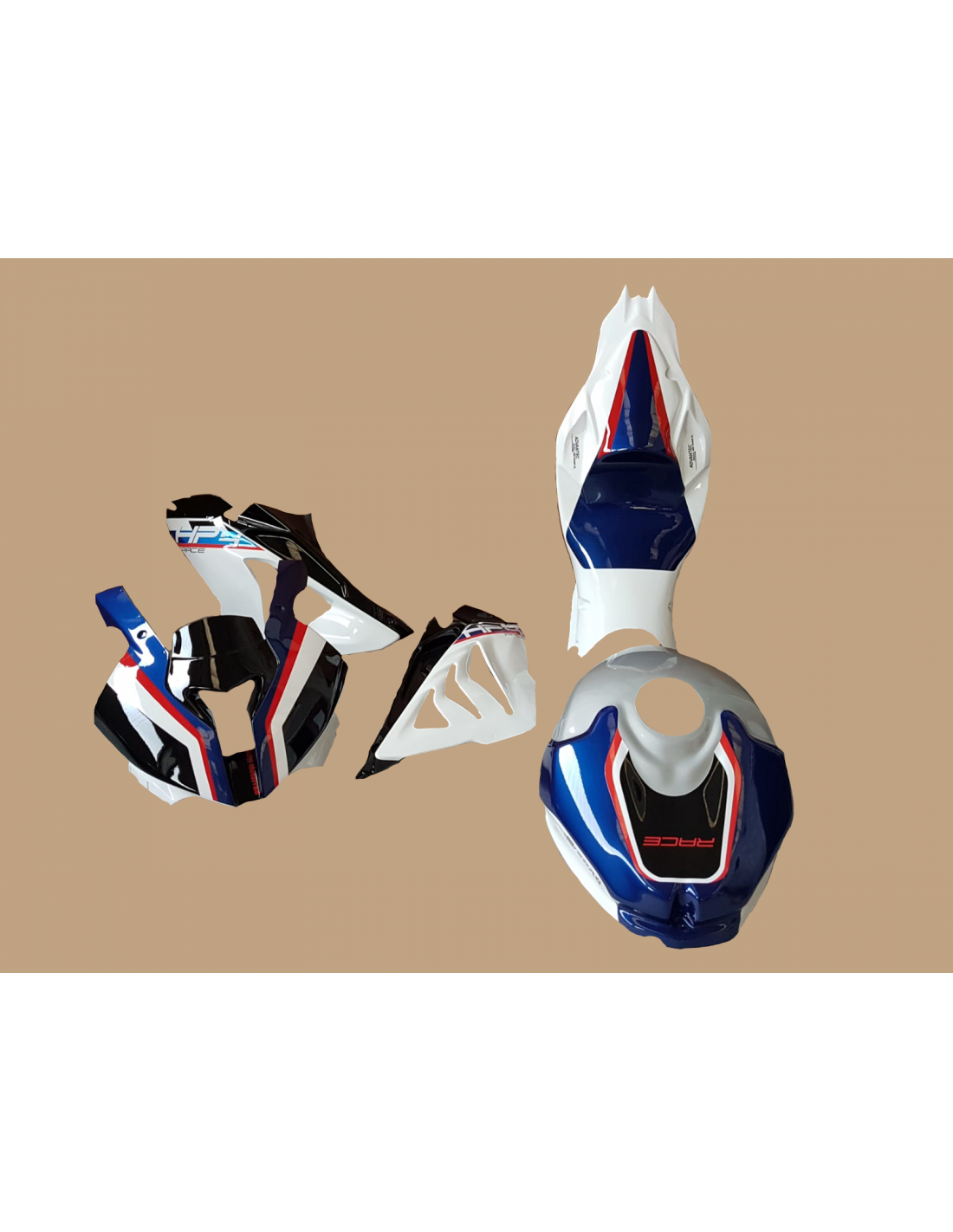 The fairing kit includes: front upper part, right and left side fairings, closed lower fairing approved for the track, tail fairing and front fender (the tank cover is not included in the price).