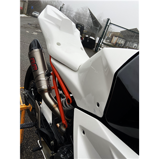 Our race fairings are made of fiberglass, they are reinforced in carbon and Kevlar in the stress areas. We include a closed lower fairing that allows to catch the liquids, so our fairings are approved for the various championships and for the amateur usage on the tracks. We mark where you should drill the holes, so you can make the hole according to the dimension of the screw you are going to use.