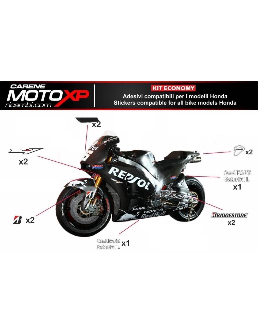 Stickers are produced with high quality materials and are adapted on the dimensions of the bike that the customer indicates during the purchase. The kit includes all non-original stickers, in order to complete the desired design: for front upper part, right and left side fairing, belly pan, back seat, swingarm and front fender. It’s possible to customize stickers too (colours, numbers, names, etc). It’s important to write changes in the field “more information”. The price of the sticker kit doesn’t change, unless substantial modifications (e.g. fluorescent colours). Through the purchase, you accept the sales conditions. You can stick them under the clear coat or after it. Unless a different request of the customer, we will supply the sticker kit with the protection.