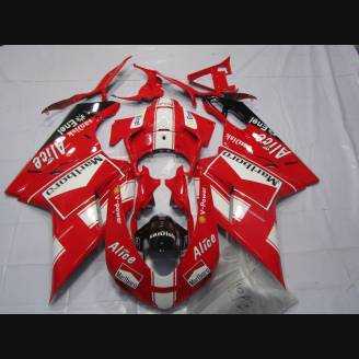 Elite:utilizamos los colores originales de la moto (Rojo Ducati); los adhesivos están impresos con varios tonos gracias a nuestro plotter de corte y de impresión de 8 colores con tintas ECO-SOLMAX2 con una alta calidad y resistencia a la luz solar hasta 7 años garantizados por la empresa APA Italia que nos da los materiales necesarios para el corte y la impresión. Los adhesivos están cubiertos por tres capas de transparente y eso los hace brillar durante 7 años. Además todo el carenado está pintado en el interior.