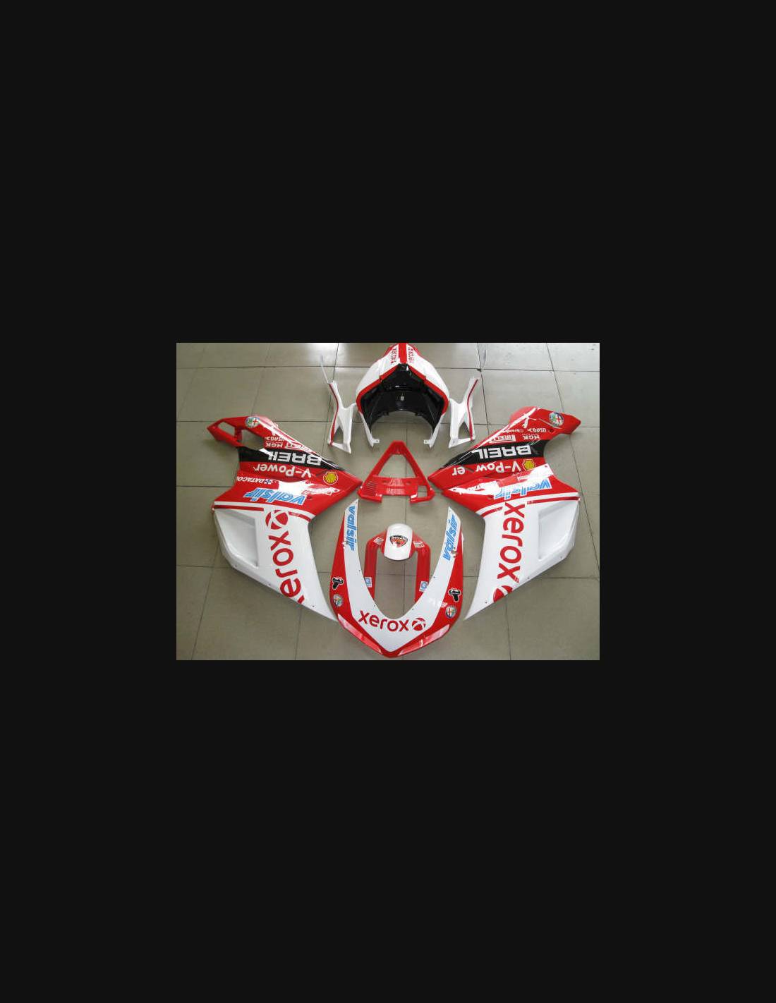élite : nous utilisons les couleurs originales de la moto (Rouge Ducati) ; les adhésifs viennent imprimé avec les nuances différentes grâce à notre ploter de coupe et de presse aux 8 couleurs et aux encres ECO-SOL MAX2 avec une qualité et une résistance aux rayons solaires jusqu`à les 7 ans garantis par la maison APA Italie que nous fournit les matériels de presse et de coupe. Ces matériels sont mis sous 3 couches de transparent de manière telle qu’ils restent luisants pour bien 7 ans. En outre, le carénage entier est peint à l`intérieur.