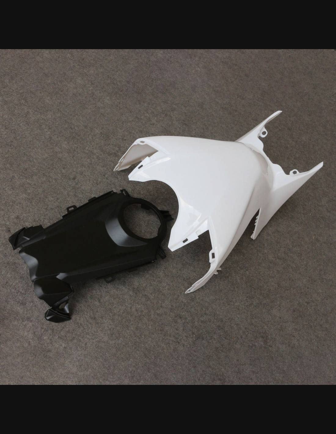 The fairing kit includes: front upper part, side fairings right and left, lower fairing right and left, back seat, front fender, tank cover and all eventual internal black plastics.